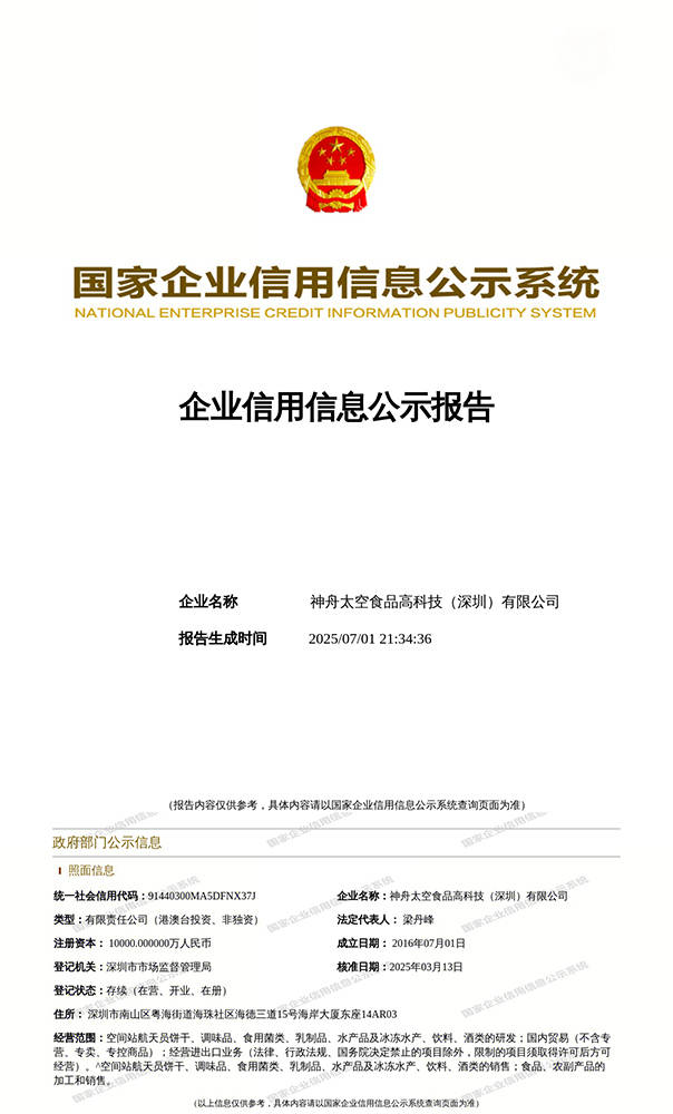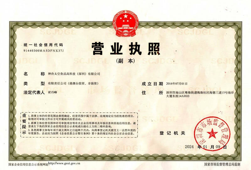神舟太空食物高科技(深圳)无限公司独家具有中国航天员科研锻炼核心的空间坐航天员食物专利手艺——《空间坐航天员高能压缩食物及其制法》,专利号为ZL2。3。这一空间坐航天员食物专利手艺,犹如企业成长的坚忍基石,为产物正在市场上建立起一道难以跨越的焦点壁垒。